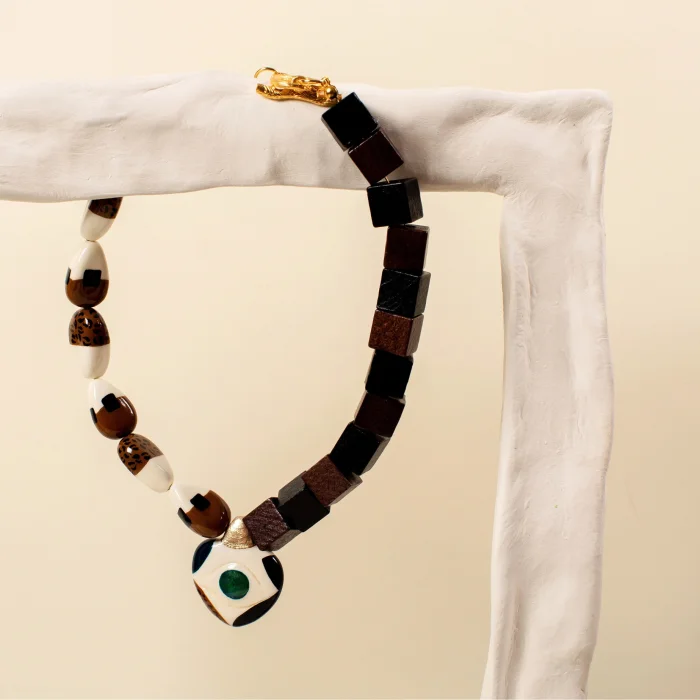 The evil eye heart and almond pieces are hand-shaped from clay, the patterns are hand-painted. The cube pieces are raw wood. The metal parts are gold-plated. The length of the necklace between the two clips is 46 cm. *Product dimensions mentioned are approximate, may vary slightly for each piece.