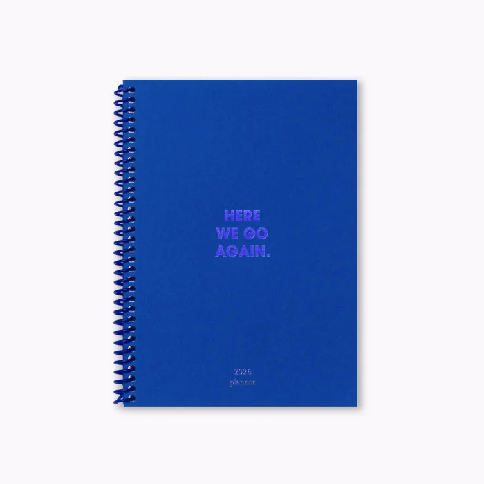 Here We Go Again is a little sarcastic, a little funny, an agenda with both monthly and weekly planning pages. It's a game, sarcastic writing, with something fun on every page. (It is especially recommended to examine the colored pages.) A5 size (14.8x21 cm) 160 pages Cover: 300 gr. blue leaf application on blue paper Inner Pages: 110 gr. white paper Monthly planning pages Weekly planning pages Note pages Some fun pages The contents are in English.
