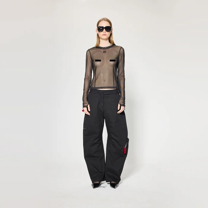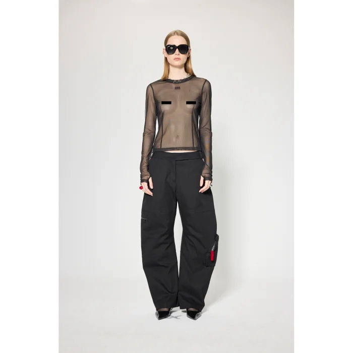Fabric: Bi-stretch fabric Volume: Loose fit, mid-waist Length: Long length Detail: Front zipper closure, zippered pockets, red ribbon accessory and red rivet detail