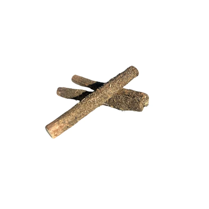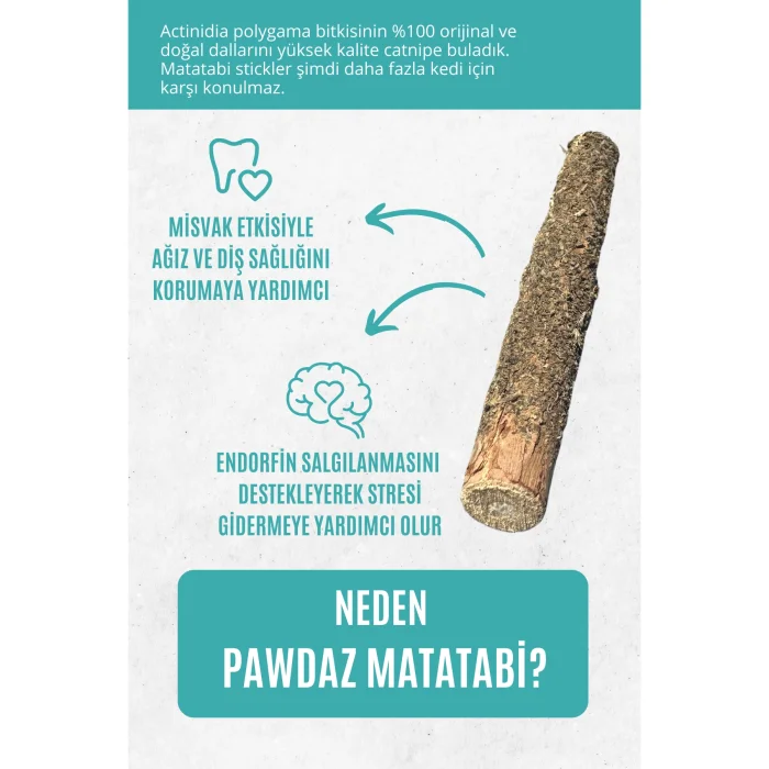 , so cats love to hug, rub and gnaw on it. Matatabi Stick is now covered in catnip and is more attractive to cats. In addition to the mental comfort your cat experiences during the time he spends with Catnipli STICK, he removes the residues on the surface of his teeth with the effect of miswak thanks to his gnawing. Catnipli STICK thus helps to maintain dental and oral health in the long term.
