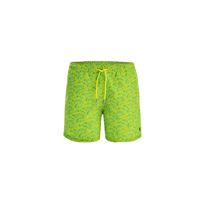 Yellow-Green patterned swim shorts. Fabric: 100% Polyester. Hand washing should be done. Soap should not be used. It should not be ironed. It should be dried by laying it flat. It has water repellency. Father & Boy combination can be made.