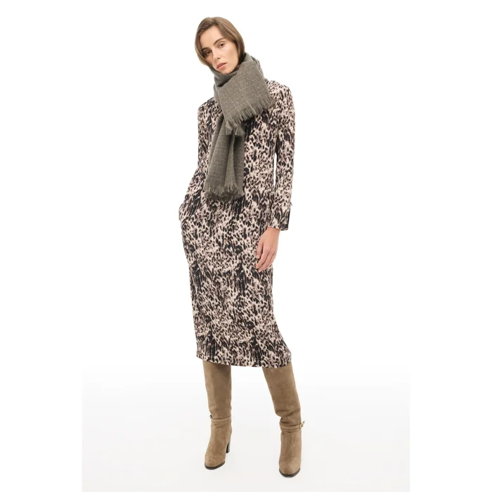 Product Details: The dress, which stands out with its 100% viscose texture, attracts attention with its crew neck design and cut.; The brown tone offers timeless elegance with its leopard look; The zipper closure detail provides ease of use, while the long sleeve form increases comfort.; You can safely choose it both in your daily style and in special meetings.; Pattern : Regular Fit Sleeve : False Sleeve Collar : Crew Neck Sleeve : Long Sleeve Model Length : Midi Length Woven-Knitted : WOVEN Gender : Women's Place of Production : Turkey Pattern : Leopard Blend : 100% Viscose Closure Type : Zipper Season : 2025 - 2026 AUTUMN WINTER Age Group: WomenSleeve Length: Long Sleeve