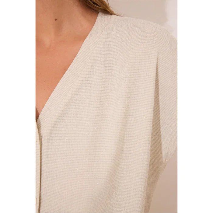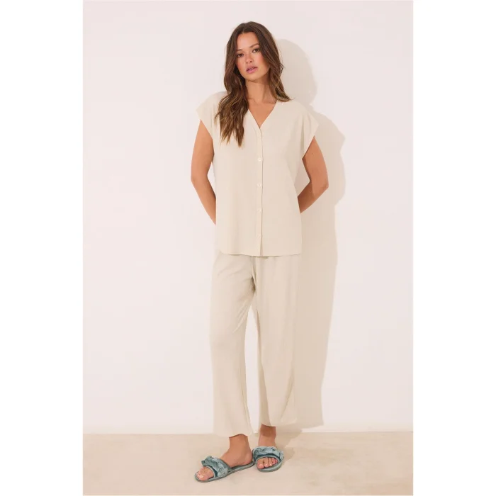 Combining sparkle with simple elegance, this beige glitter pajama set is designed to add an elegant touch to your home wear. Thanks to its slightly glossy surface, it completes the simple look with a modern sparkle.