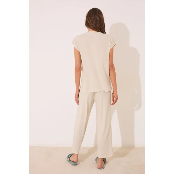 Combining sparkle with simple elegance, this beige glitter pajama set is designed to add an elegant touch to your home wear. Thanks to its slightly glossy surface, it completes the simple look with a modern sparkle.