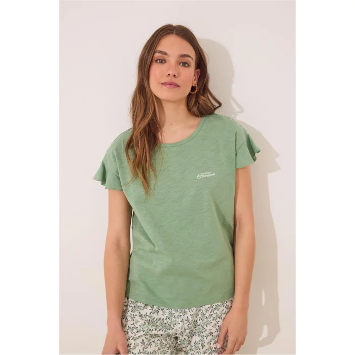 The green floral patterned pajama set, which carries the freshness of natural tones, adds soft comfort to every moment spent at home. While it offers freedom of movement all day long with its light texture and comfortable fit, it also highlights your style in home wear with its fresh appearance.