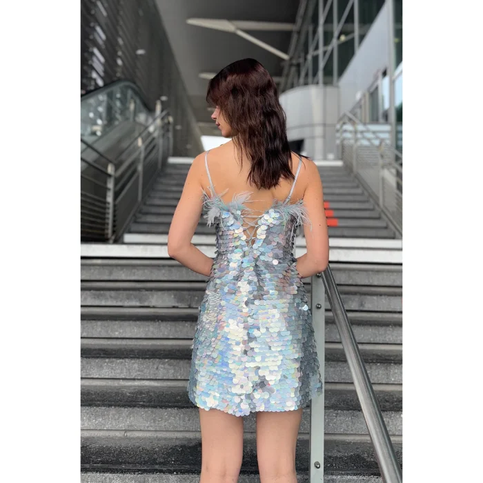 Grey Hologram Payette Mini Dress With Feathers Luna