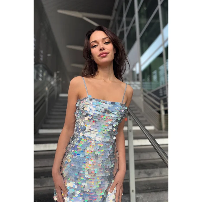 Grey Hologram Payette Mini Dress With Feathers Luna