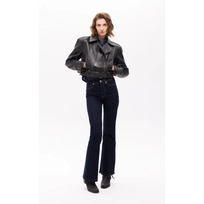 Introducing the Lita Biker Jacket, crafted from luxurious calf leather with a vintage finish. Adorned with elegant epaulettes and a belted cuff accented with metal hardware, this jacket exudes a timeless sophistication.