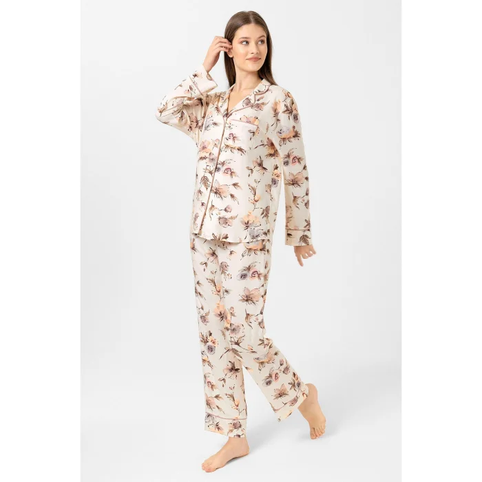 Cream-colored, pastel floral pattern, special digital print, Hera pajama set. Dried rose piping offers a stylish look. Thanks to the belt, the trousers can be adjusted to your waist. The front-buttoned top provides ease of use for breastfeeding people.