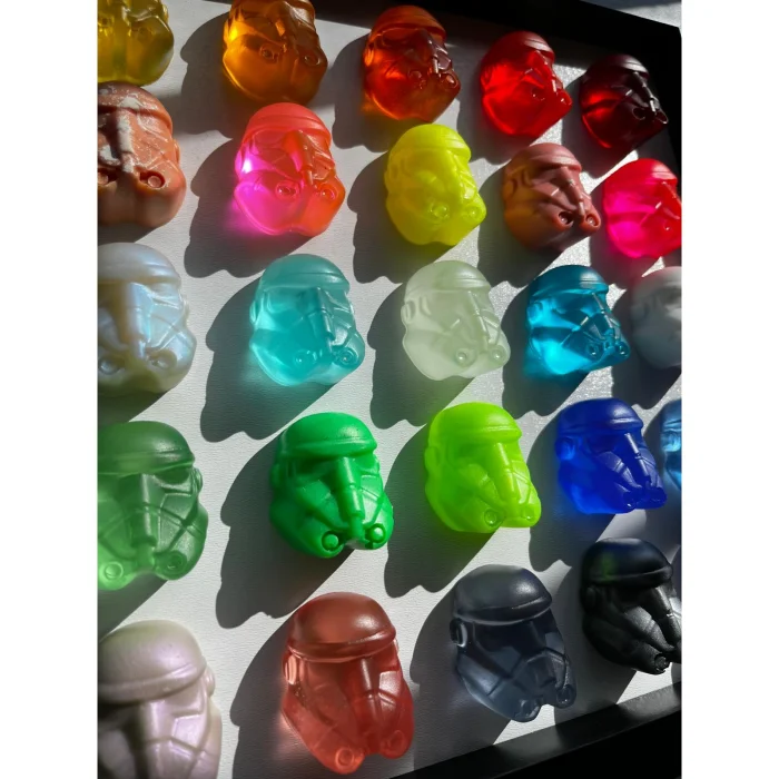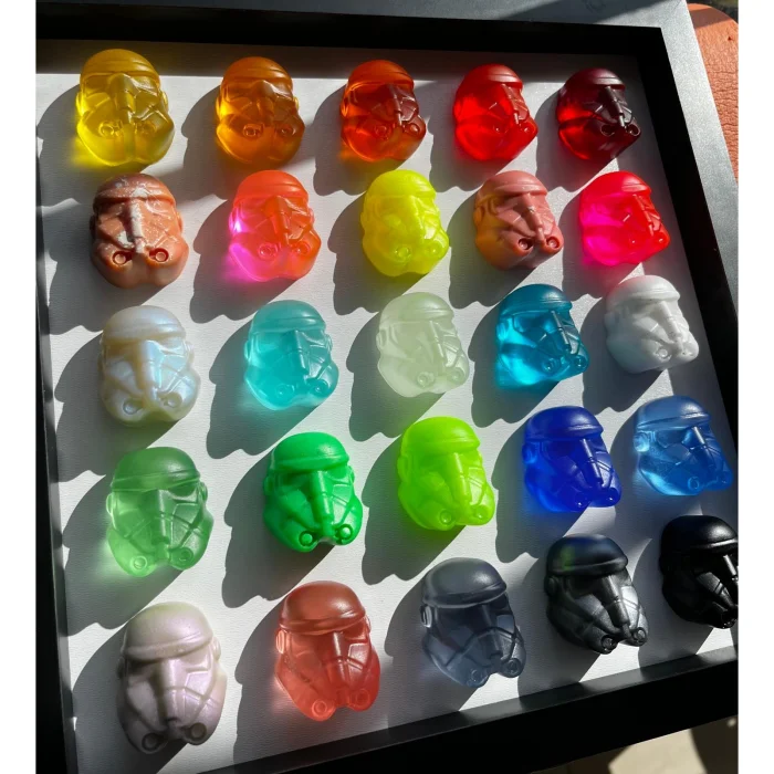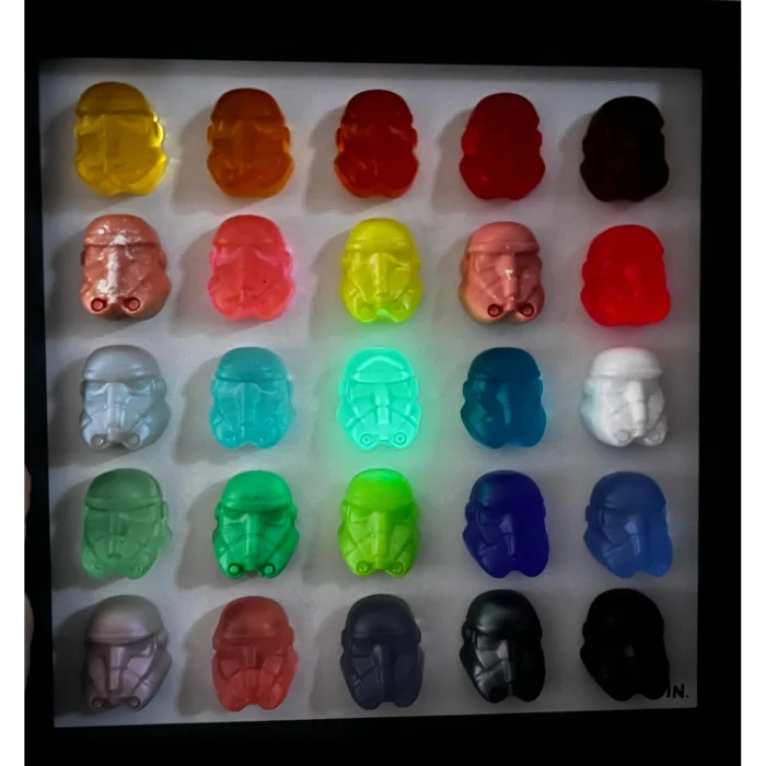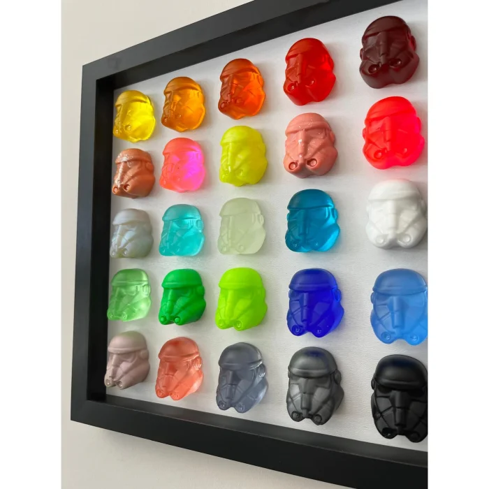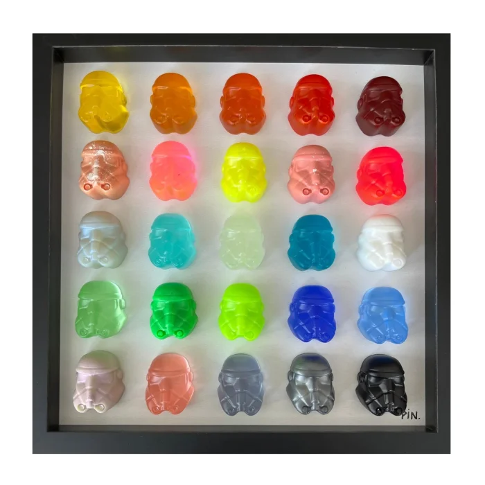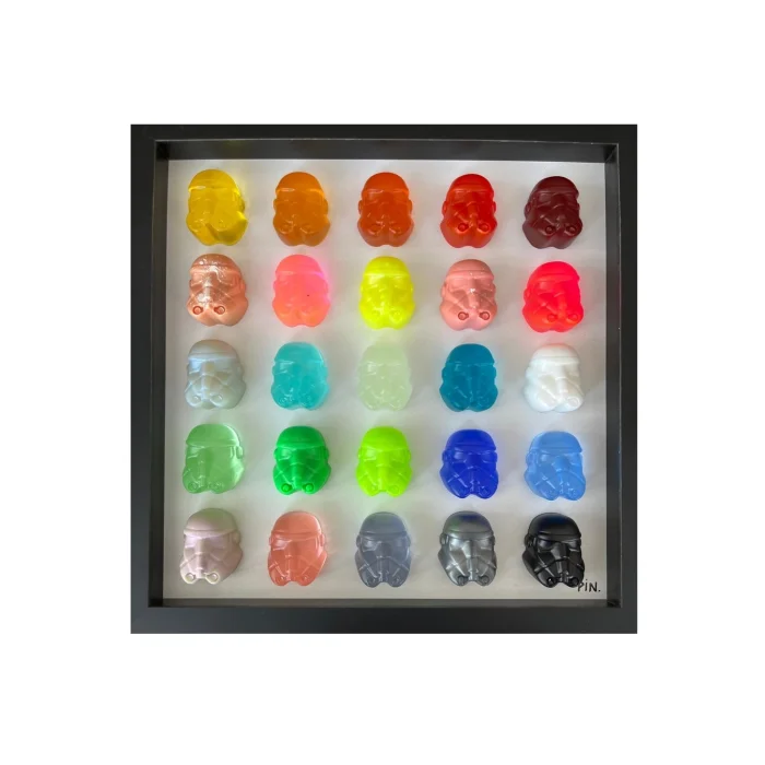 It consists of 25 epoxy figures in a black square frame, measuring 30 x 30 cm.