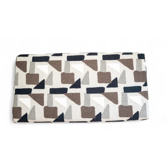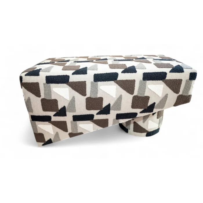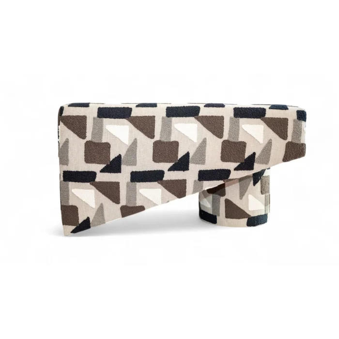 The bench is a timeless piece of furniture shaped with modern lines. Its asymmetrical form and cylindrical leg break away from classical design, presenting an artistic stance. The fabric is enriched with textured geometric patterns—creating a retro-modern harmony with shapes in brown, black, gray, and cream on a beige background. With its minimal yet striking presence, it fits effortlessly into both residential interiors and stylish public spaces. This bench, where comfort and aesthetics meet in balance, is also a form of expression.