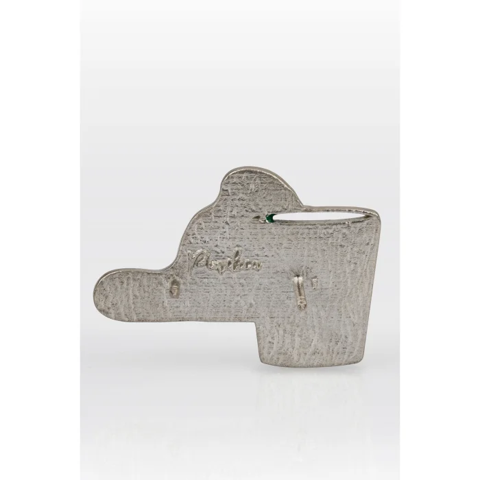 Silver-plated, enamel-painted metal alloy pin.