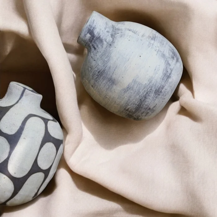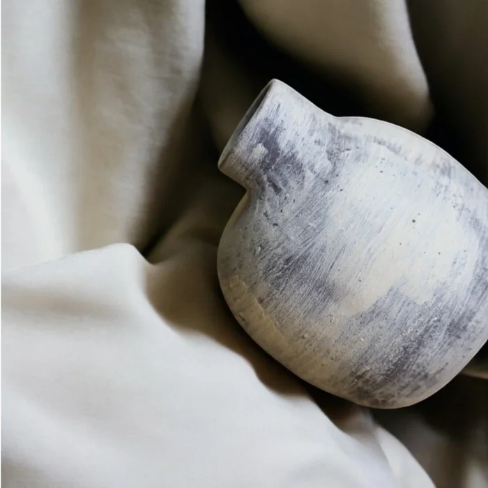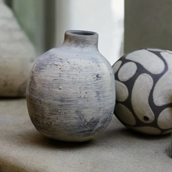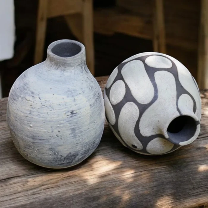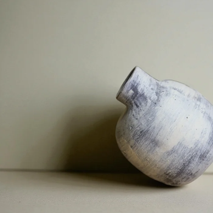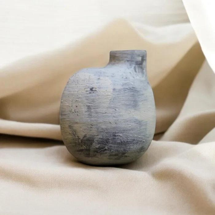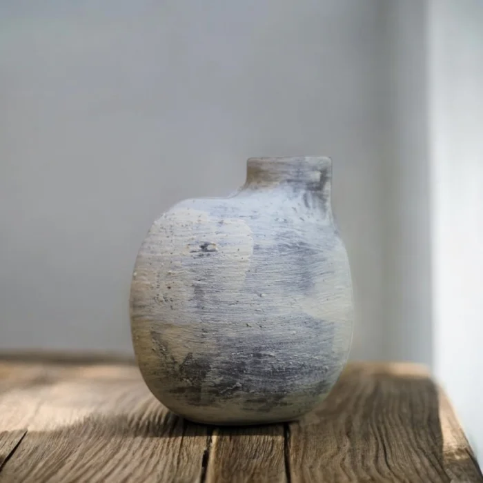 This product, which is produced by hand forming, is made only 1 piece using stoneware ceramic mud. It is decorated with white stoneware mud applied on spotted stoneware mud. The vase, which is baked at 1250 degrees, is highly resistant to impacts and falls. Altitude; about 11 cm, width; about 13 cm. Mouth width; about 3 cm.