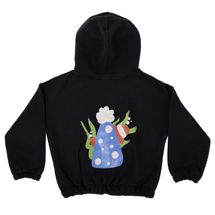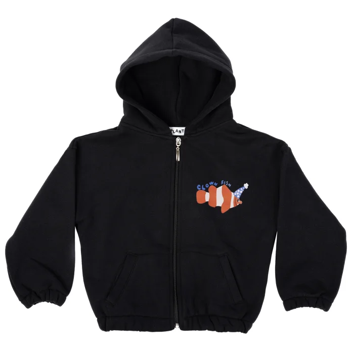Offering comfortable use with its soft and warm fabric, this black hooded sweatshirt adds a fun look to daily combinations with its clownfish print on the front and back.