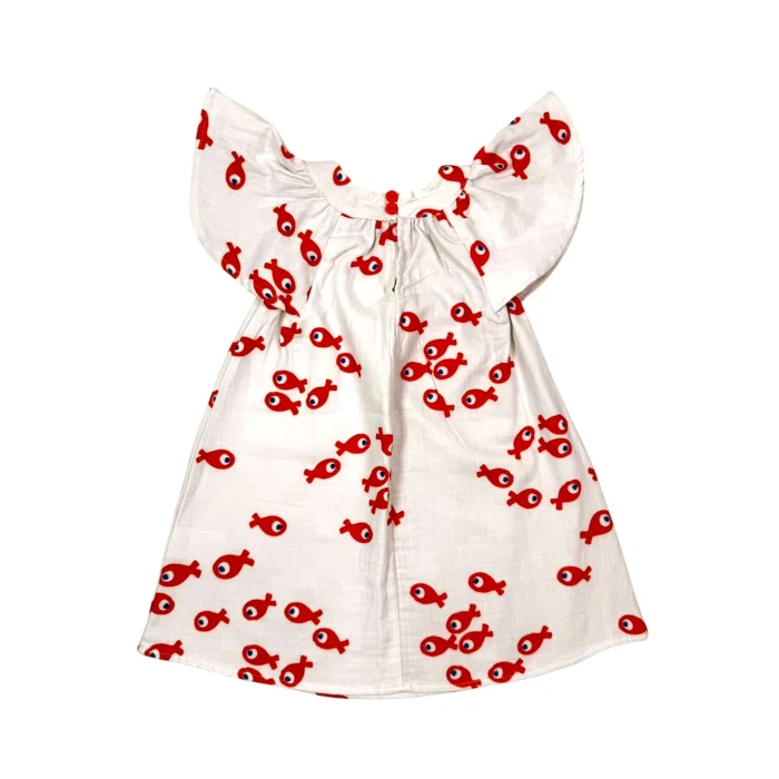 Red Fish Dress has a breathable and extremely light structure thanks to its 100% cotton double-layer crinkle woven fabric. The button detail on the back neck makes it easy to wear and at the same time offers an aesthetic touch. This dress, which gives children a cheerful style with its vibrant red fish patterns, will be an ideal choice for both daily use and special occasions in summer. While it prioritizes the comfort of children with its flounced arms and natural texture, it makes a difference with its original design.