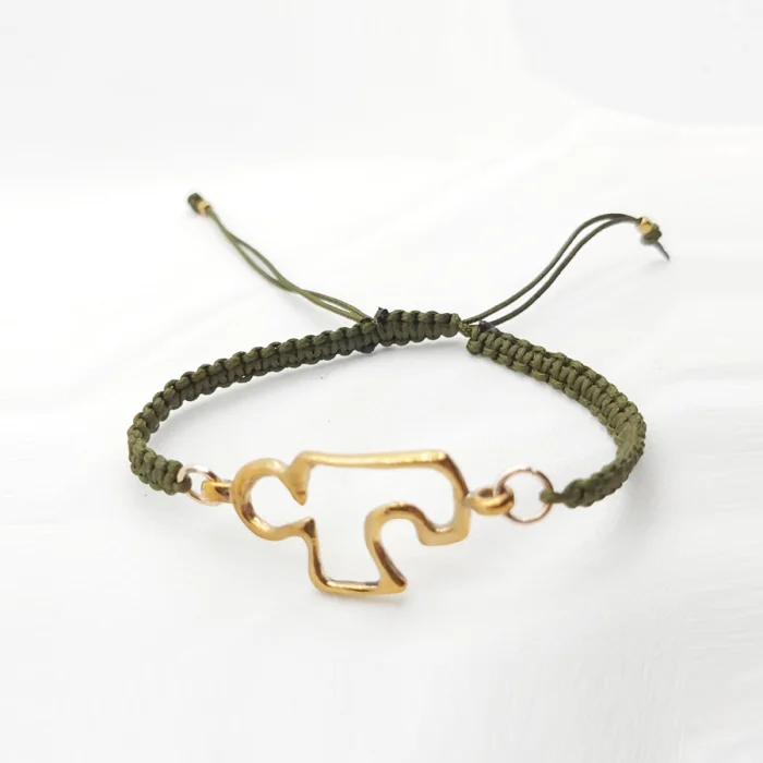 This design, in which the symbol puzzle piece, which is cast in bronze with the lost candle technique, is paired with a colorful and adjustable knitted bracelet, comes with a story card.
