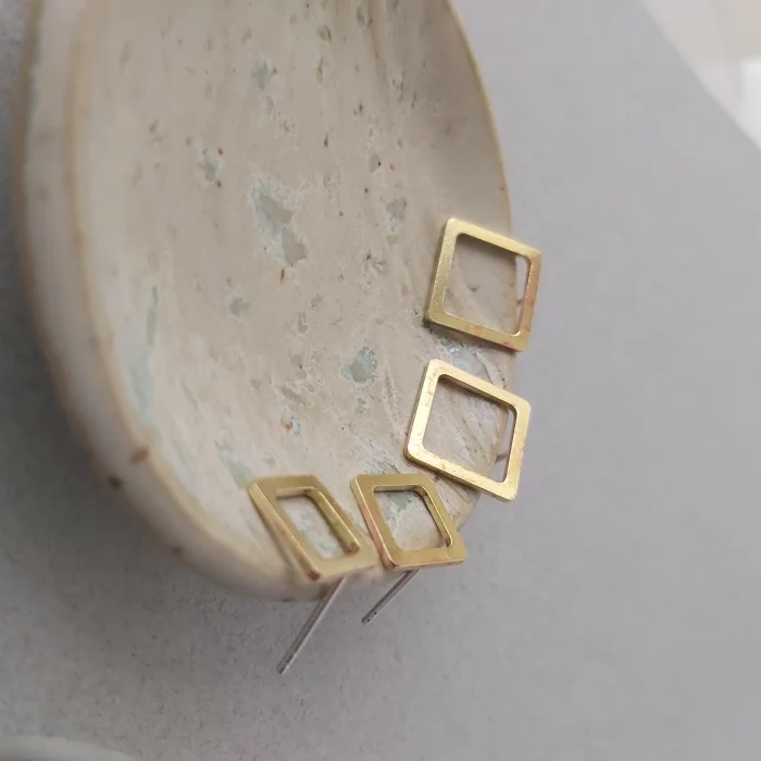 The ear plugs of the brass geometric earrings are silicone; ear pins are 925 sterling silver.