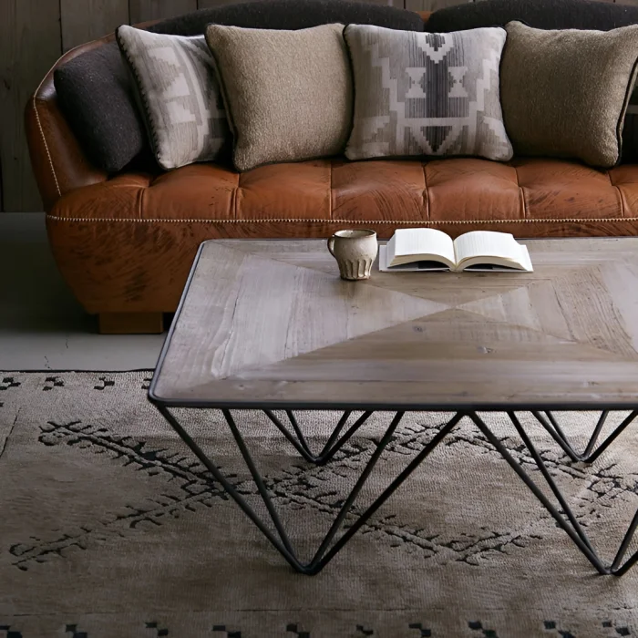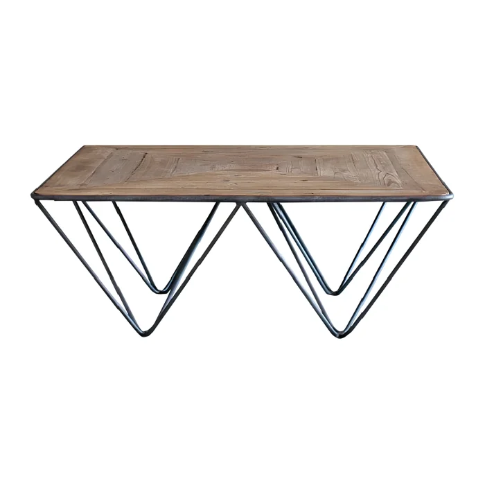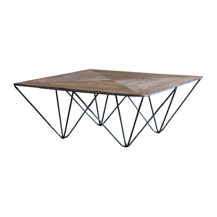 This modern coffee table, measuring 100x100 cm; It combines the warmth of natural wood with the sculptural form of metal in the same design. The triangular surface detail adds character to the space, while the geometric metal frame structure provides a stylish and light stance.