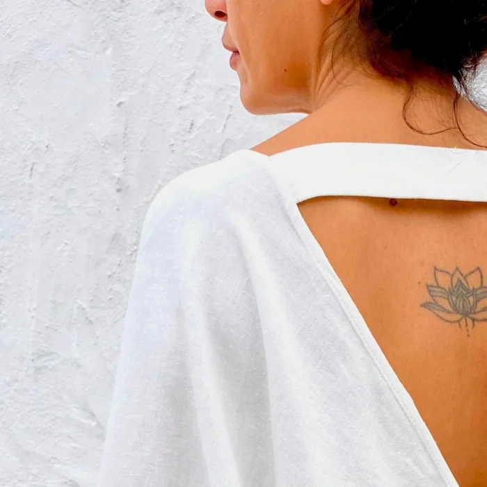 V-neck blouse with two-tone back detailing.