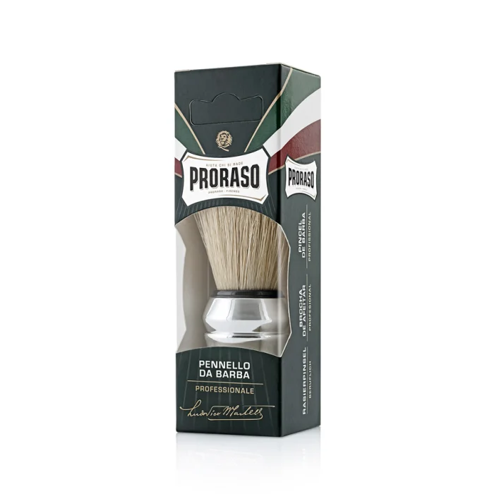 The professional Proraso shaving brush is made with natural bristles. Their length and stiffness have been specially designed to encourage the best soapy lather and to delicately, yet energetically massage the beard.