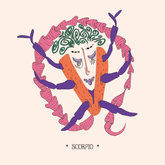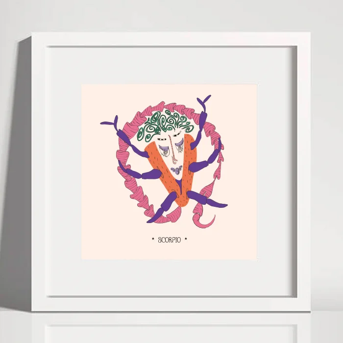 Scorpio Astrology Themed Illustration Fine Art Print The work was digitally drawn by artist E.Büşra Tekin on behalf of the QUFF brand. Type: Illustration / Modern Wall Decor Printing: Fine Art Size: frameless size 20×20 cm. The width of the mount is 2 cm. Material: High quality printing paper. Colors: Printed with vivid and durable inks. The work will be signed and sent by the artist. The color of the frame is white, the thickness is 1 cm. Uses: Home décor Office decoration Restaurant or café decoration Gift purposes