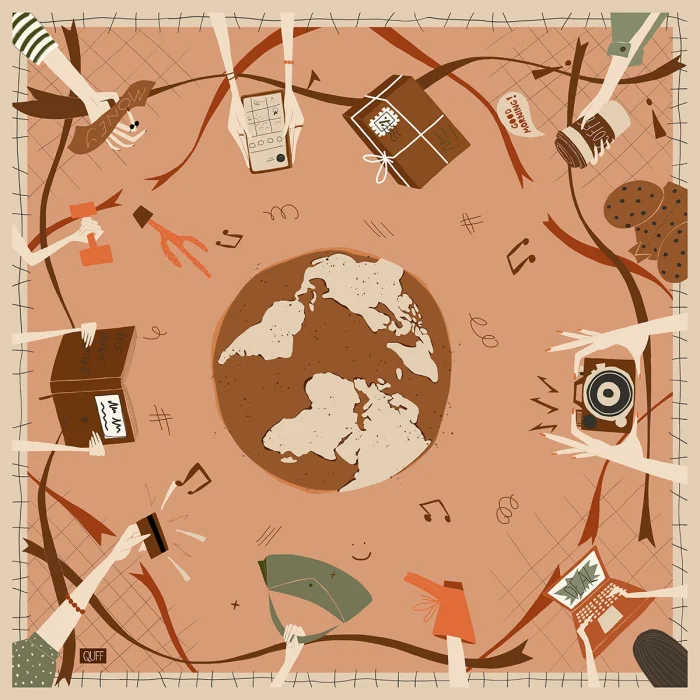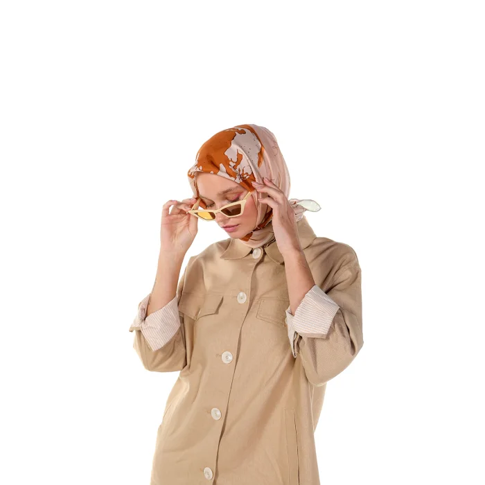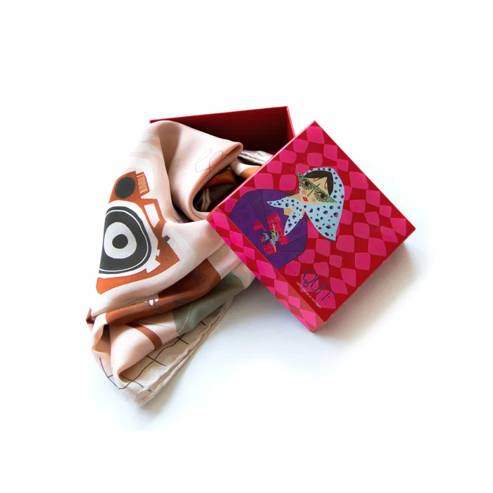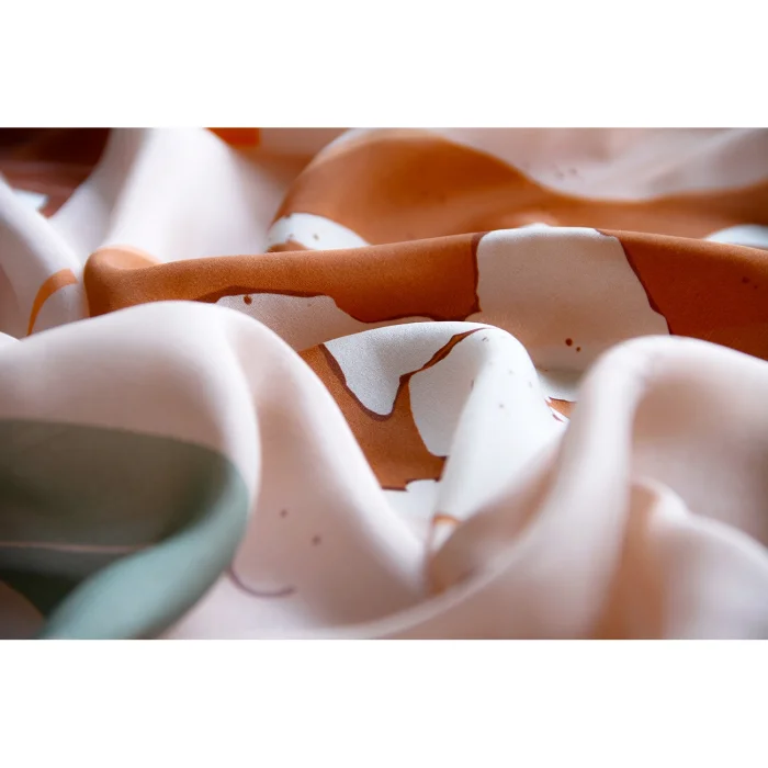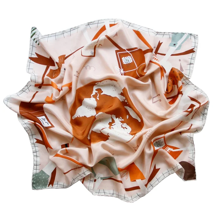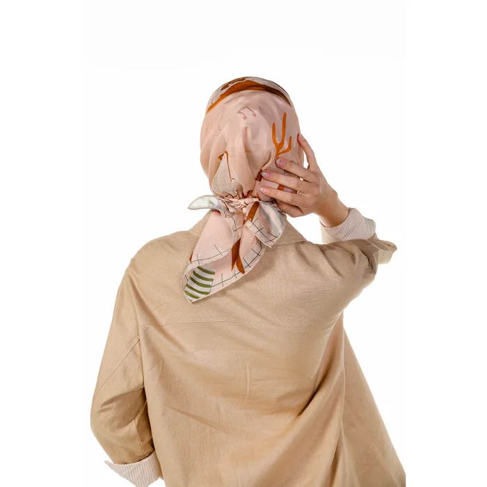Color : Beige Fabric : 100% Vegan Silk Size: 90x90cm Summer is fresh silk. Its edges are sewn by hand. The patterns are hand-drawn and digitally colored. When worn, there is no falling or slipping on the front. Shipped in special boxes. Only dry cleaning is recommended. Limited edition.