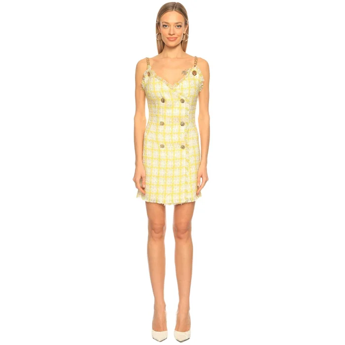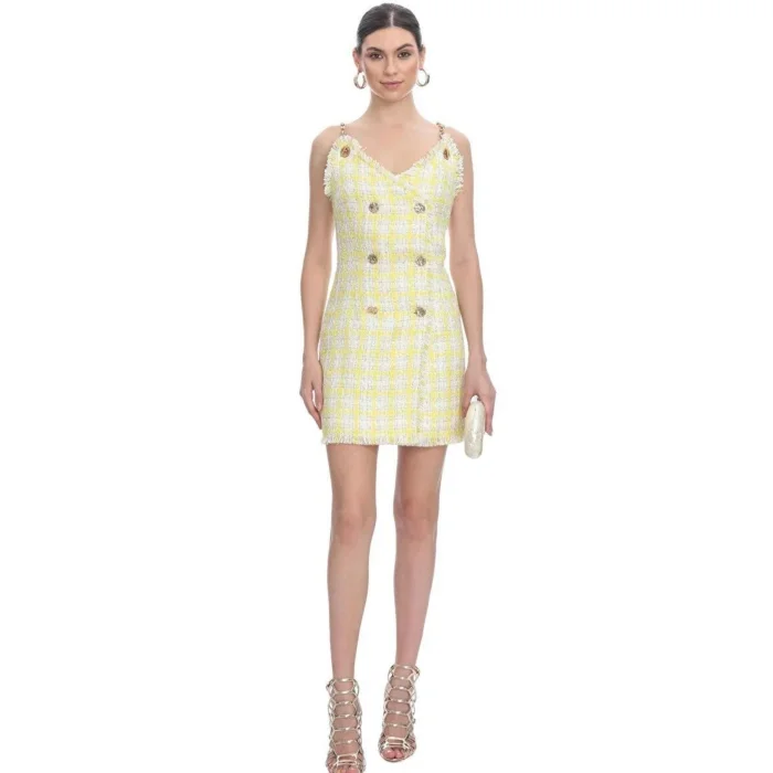 Details: Double-breasted neckline, tweed pattern, chain strap detail, yellow dress Material Type: 40% Acrylic, 30% Polyester, 20% Cotton, 10% Lurex Model Size: 90-65-90 cm Length: 1.76 cm Details: Gold button details on tweed fabric. Fabric feature: Acrylic is a type of fabric that is light in texture, warm but does not sweat. It shows high resistance to chemicals and sunlight. It is easy to wash and does not deform during intensive washing. It feels soft and cottony. The stain retention rate is very low. With its wool-like structure, it gives a feeling of warmth and naturalness. Concealed zipper and lining are used.