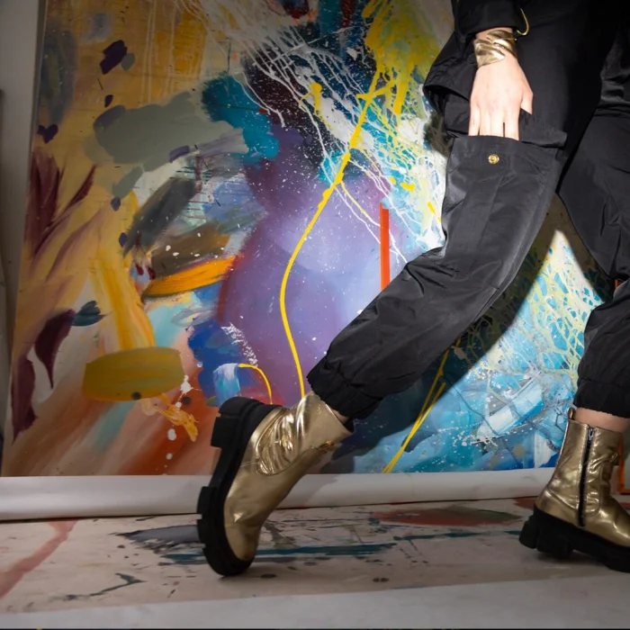 High waisted jogger pants with cargo pockets, elasticated waist, zippered gold buttons