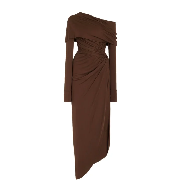 Asymmetrıcal Lycra Collar Long Dress Wıth Sıde Slıt