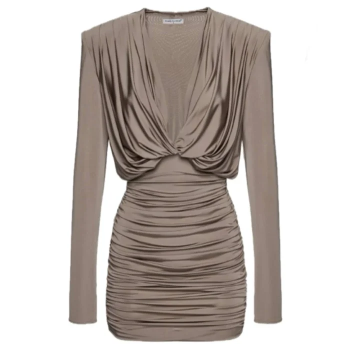 DEEP V-NECK LOW-CUT DRAPED LONG SLEEVE LYCRA DRESS
