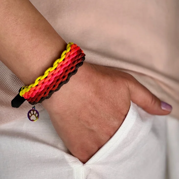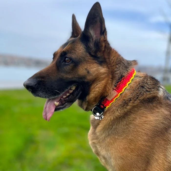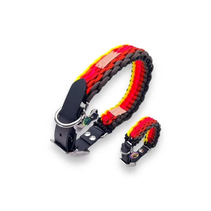 It is produced 100% handmade by combining coffee, yellow, flamingo pink, neon orange and red tones. Black vegan leather is used on the collar and bracelet. It is comfortable and useful due to its high strength and adjustability. The collar is suitable for large breed dogs. Accessories on the leash and wristband are included.