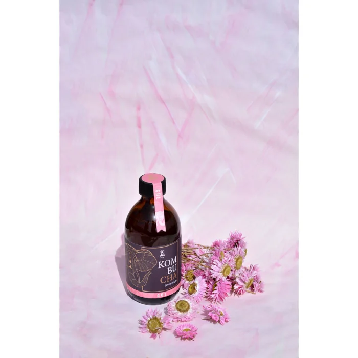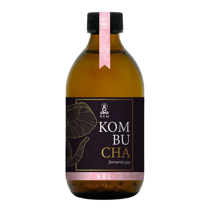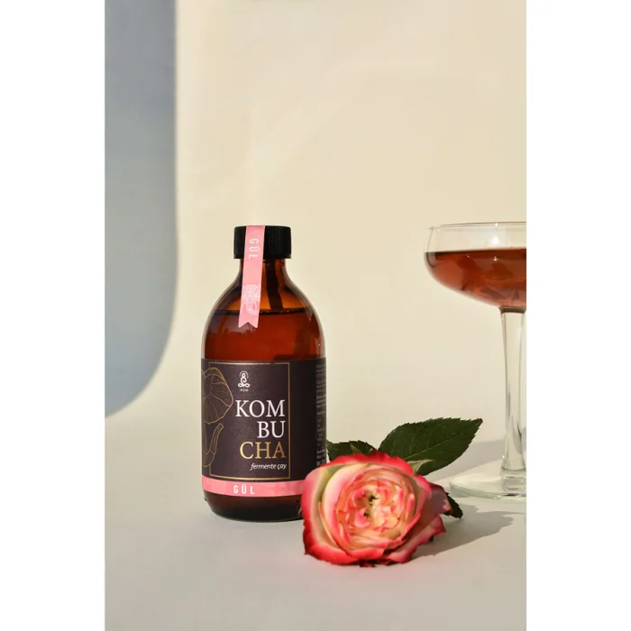 Kombucha Rose Fermented Tea: Drinking Water, Sugar, Green Tea (0.27%), Black Tea (0.27%) Kombucha Culture, Rose (0.16%). It does not contain additives, preservatives and colorants.