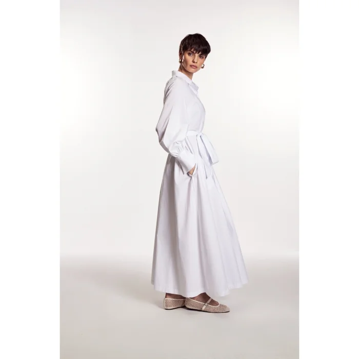 The “Serenity” model offers a perfect blend of elegance and comfort. Its long-sleeve design and belt detail at the waist create a feminine silhouette, while the button-down front and adjustable slit detail allow for personalized styling options. The lightweight and comfortable feel of the 100% cotton shirt fabric ensures all-day comfort. Suitable for all body types from XS to L, “Serenity” is ideal for both everyday wear and special occasions.