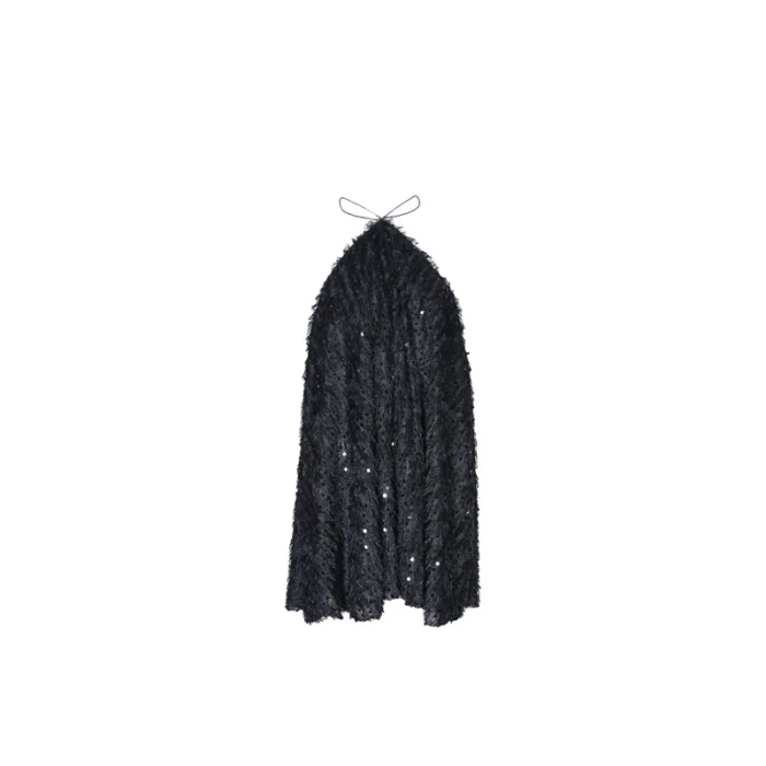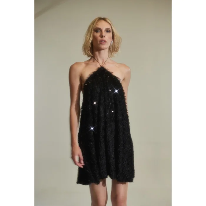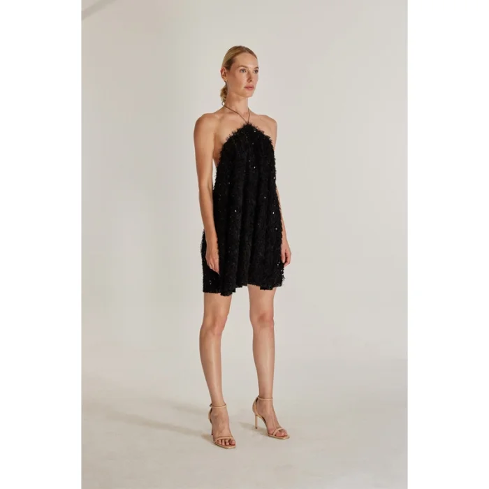 The Sunbeam Dress is a captivating mini dress made from sequined and tasseled black fabric. It features a halter neck tie and an adjustable back neckline. The Sunbeam Dress is perfect for those seeking an elegant and alluring look. With its sparkling design and attention to detail, it is an ideal choice for parties, special events, and evening occasions. The Sunbeam Dress adds a touch of glamour to your style and ensures you stand out in the crowd