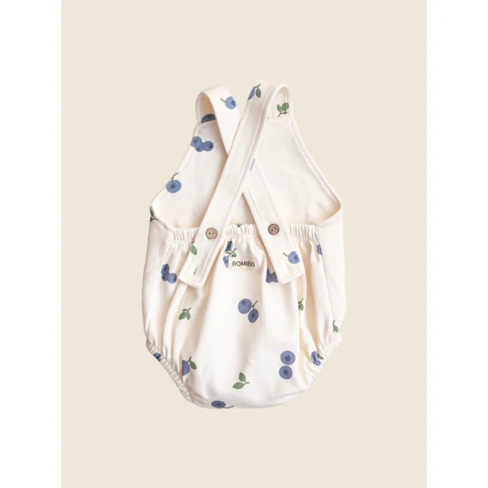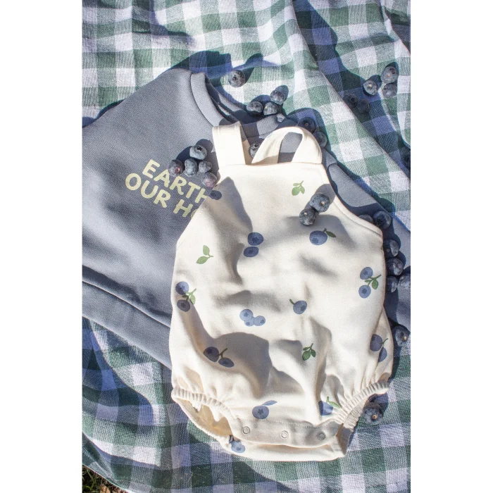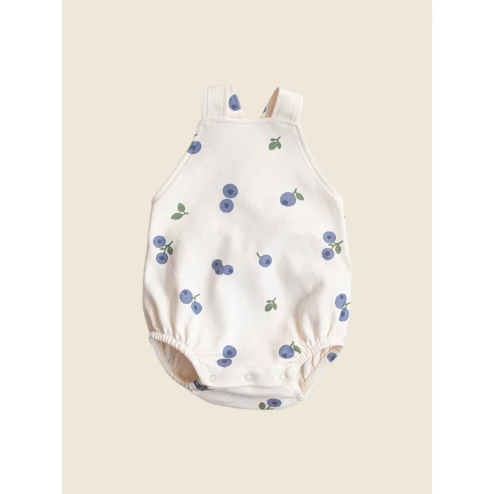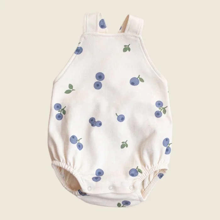 100% organic cotton, bloomer with adjustable straps at the back, snap fasteners at the bottom, Blueberry Harvest pattern.