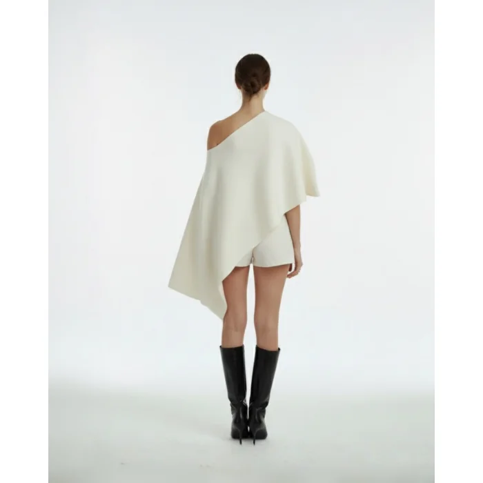 Morpho is a powerful signature piece that gives a modern silhouette to every combination with its sculptural asymmetrical form and silky knitwear texture. It reflects a minimal yet impressive design approach. Its asymmetrical and fluid cut drapes gracefully from the shoulder, creating a special volume. It is suitable for daytime style with simple trousers and evening looks with leather boots. It maintains its form with its 52% rayon, PBT and nylon blended texture. Both marbling (off-white) and black color options are available. It is light, fluid, modern and timeless.