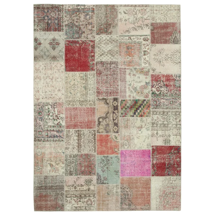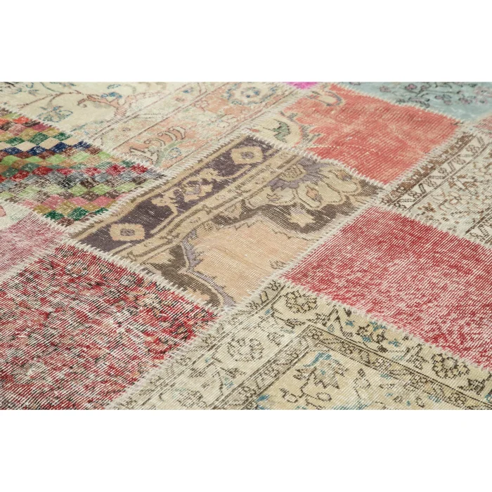Patchwork Carpet is 251 cm wide, 355 cm long and approximately 5 mm thick. It weighs an average of 25 kg. It is made with hand-spun wool and cotton. It gets its colors from root dyes obtained naturally.