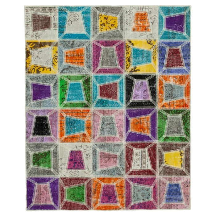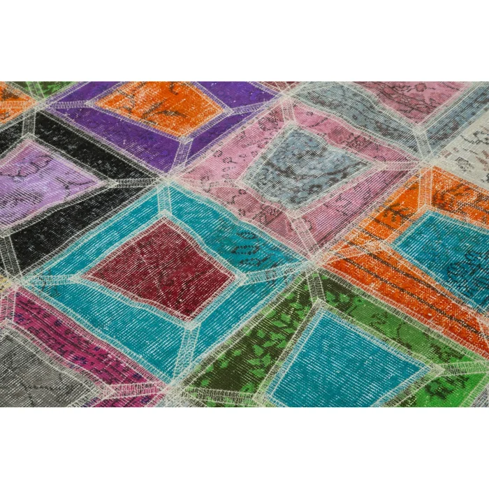Modern Design Patchwork Carpet is 193 cm wide, 236 cm long and approximately 5 mm thick. It weighs an average of 13 kg. It is made with hand-spun wool and cotton. It gets its colors from root dyes obtained naturally.