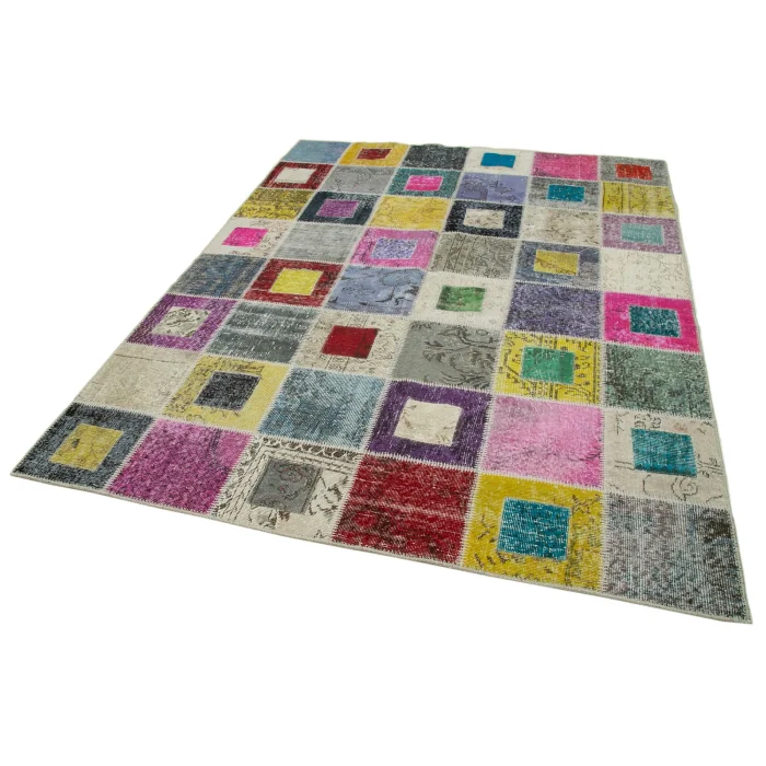 Modern Dizayn Patchwork Carpet is 179 cm wide, 236 cm long and approximately 5 mm thick. It weighs an average of 12 kg. It is made with hand-spun wool and cotton. It gets its colors from root dyes obtained naturally.