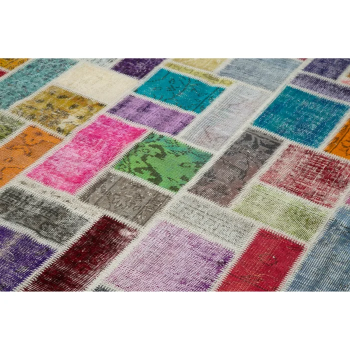 Modern Design Patchwork Carpet is 210 cm wide, 296 cm long and approximately 5 mm thick. It weighs an average of 18 kg. It is made with hand-spun wool and cotton. It gets its colors from root dyes obtained naturally.