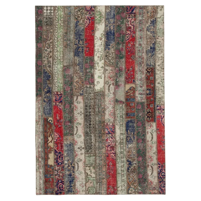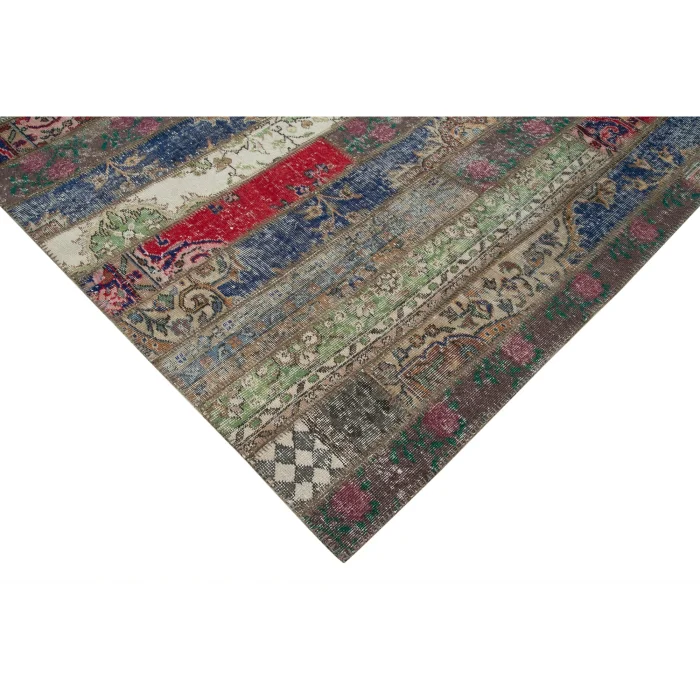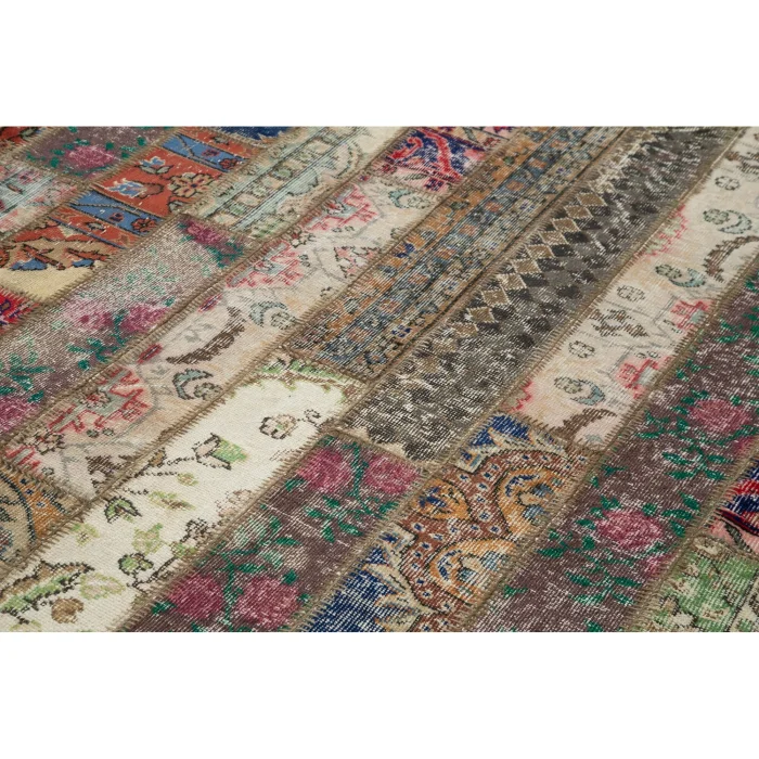 Modern Design Patchwork Carpet is 205 cm wide, 303 cm long and approximately 5 mm thick. It weighs an average of 18 kg. It is made with hand-spun wool and cotton. It gets its colors from root dyes obtained naturally.
