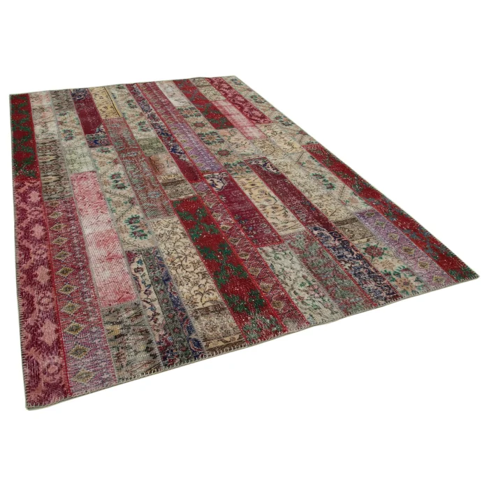 Modern Design Patchwork Carpet is 203 cm wide, 305 cm long and approximately 5 mm thick. It weighs an average of 18 kg. It is made with hand-spun wool and cotton. It gets its colors from root dyes obtained naturally.