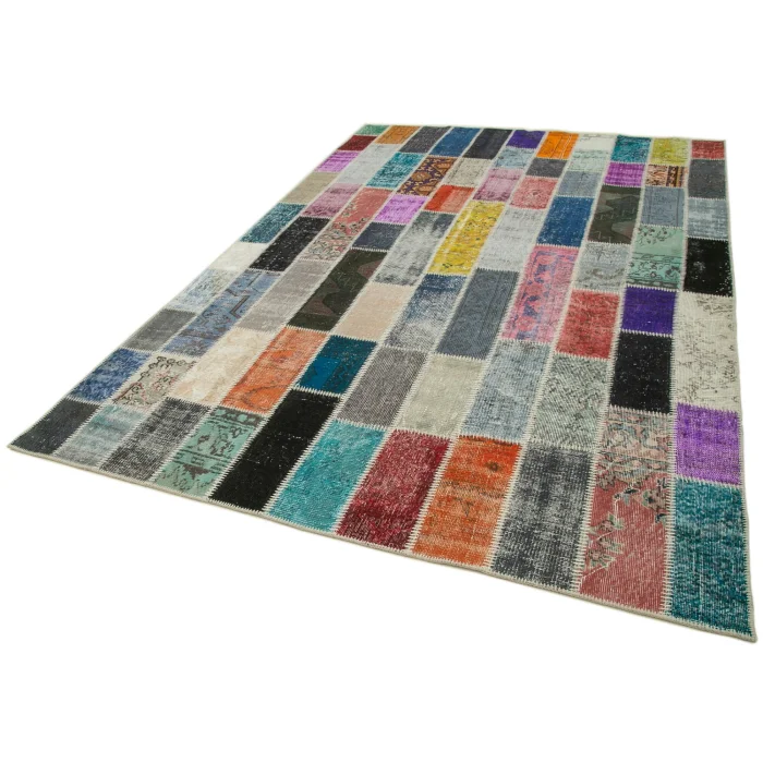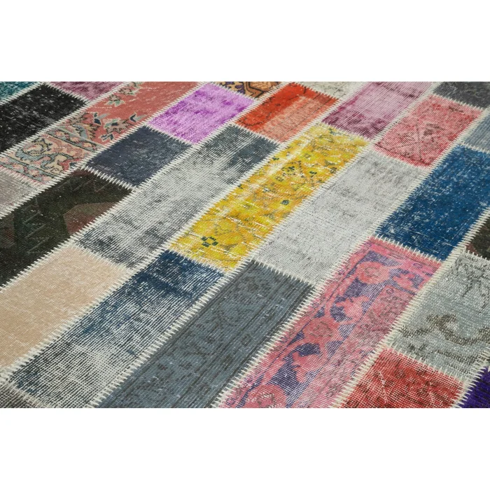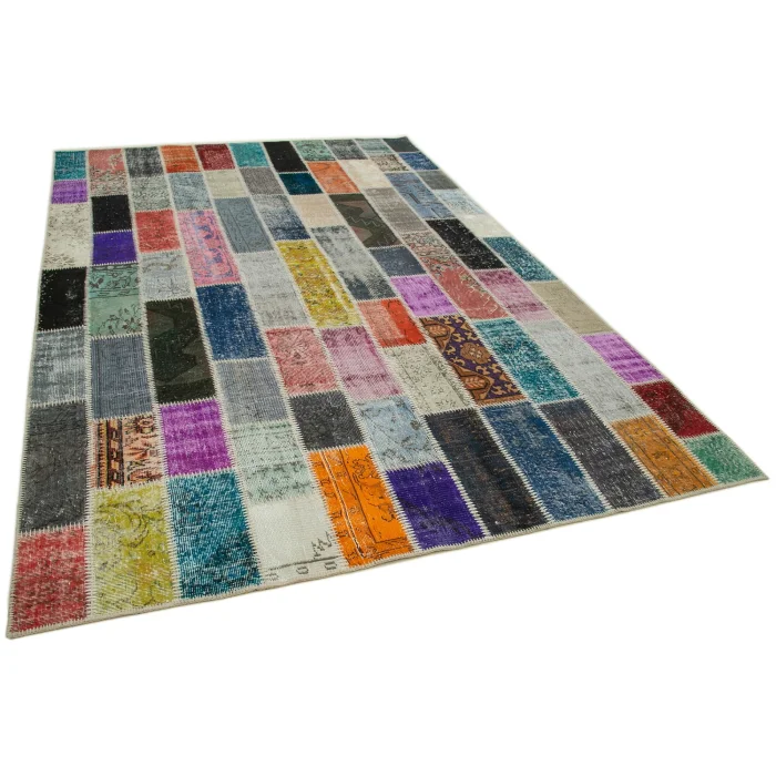 Modern Dizayn Patchwork Carpet is 206 cm wide, 306 cm long and approximately 5 mm thick. It weighs an average of 18 kg. It is made with hand-spun wool and cotton. It gets its colors from root dyes obtained naturally.
