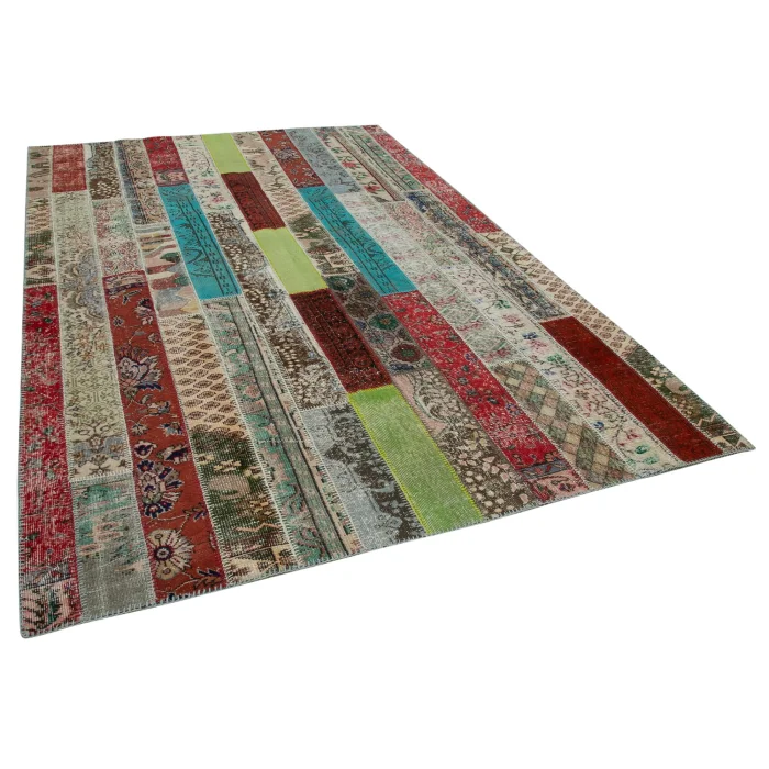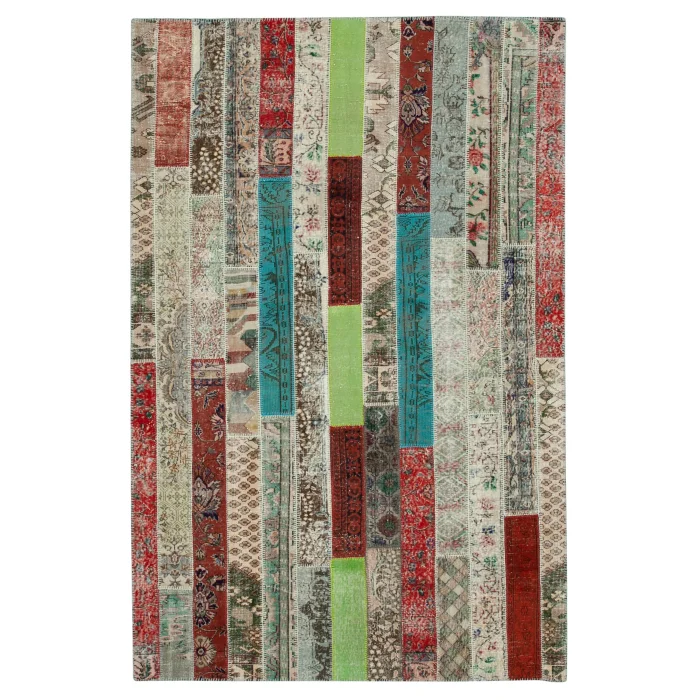 Modern Dizayn Patchwork Carpet is 203 cm wide, 308 cm long and approximately 5 mm thick. It weighs an average of 18 kg. It is made with hand-spun wool and cotton. It gets its colors from root dyes obtained naturally.