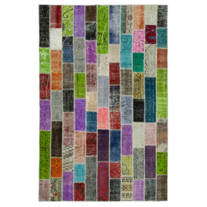 Modern Design Patchwork Carpet is 198 cm wide, 304 cm long and approximately 5 mm thick. It weighs an average of 17 kg. It is made with hand-spun wool and cotton. It gets its colors from root dyes obtained naturally.