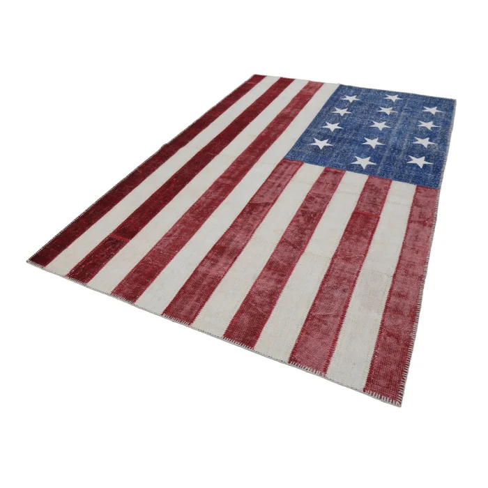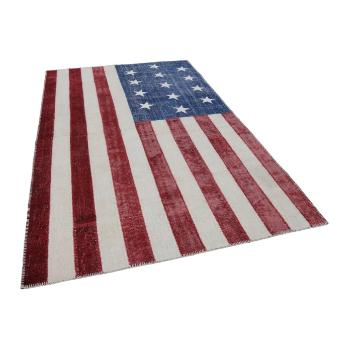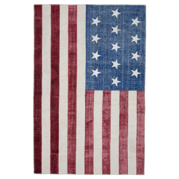 Flag Patchwork Rug 196 cm width and 300 cm length and the pile height is 5mm, the approximate weight of the rug is 16 kg. It’s % 100 hand knotted wool and goat hair rug. It’s made from the natural dye.