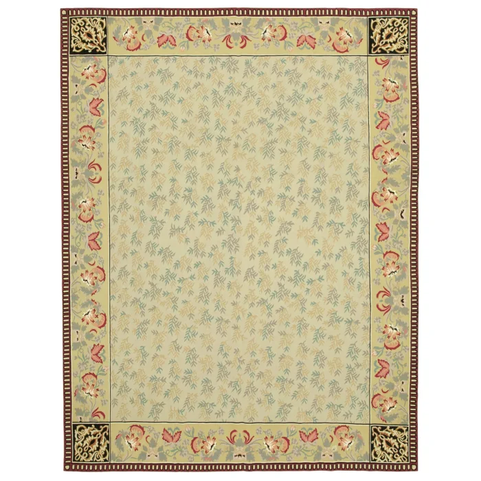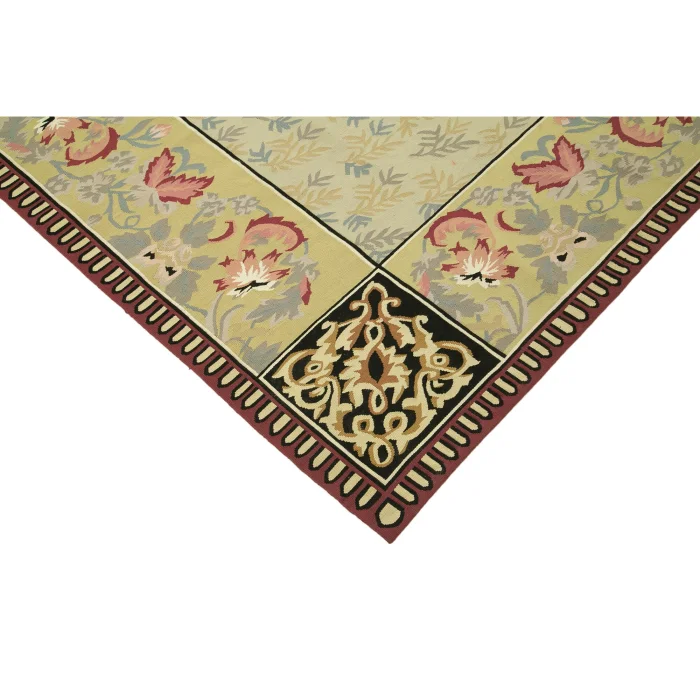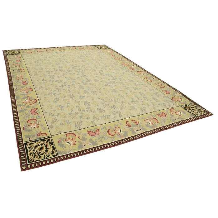 The Aubusson Kilim is 273 cm wide by 367 cm long and about 5 mm thick. It weighs an average of 12 kg. It is made with hand-spun wool and cotton. It takes its colors from root dyes obtained naturally.
