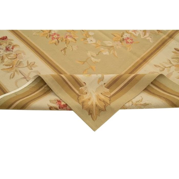 The Aubusson Rug is 272 cm wide by 362 cm long and about 5 mm thick. It weighs an average of 11 kg. It is made with hand-spun wool and cotton. It takes its colors from root dyes obtained naturally.