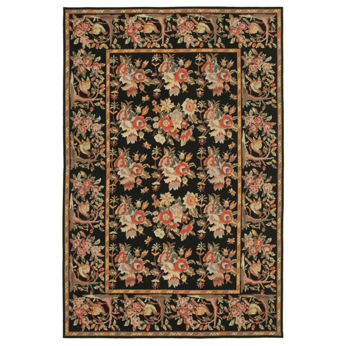 The Needlepoint Rug is 183 cm wide by 274 cm long and approximately 5 mm thick. It weighs an average of 6 kg. It is made with hand-spun wool and cotton. It takes its colors from root dyes obtained naturally.