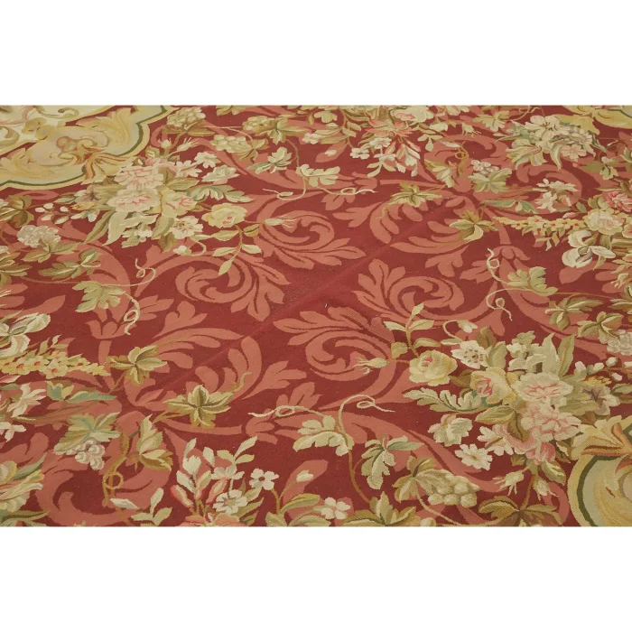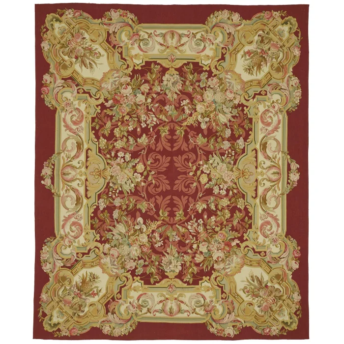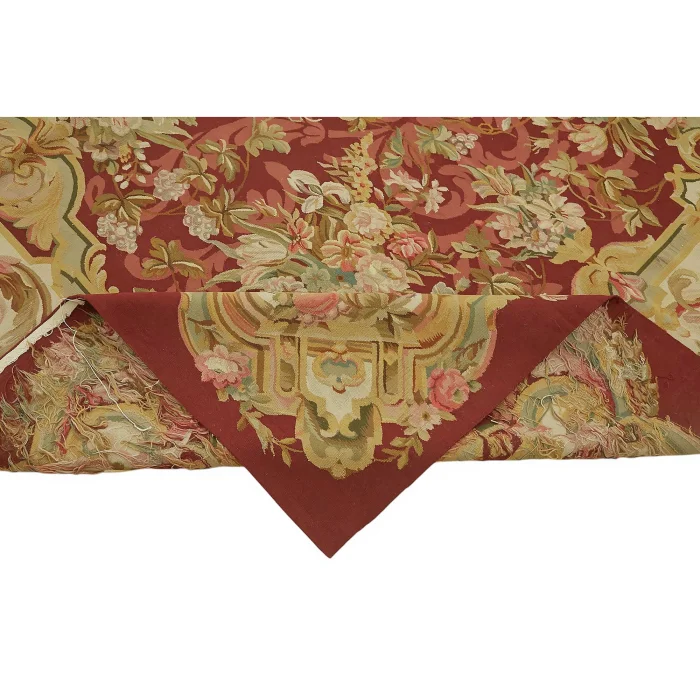 The Aubusson Rug is 255 cm wide by 310 cm long and about 5 mm thick. It weighs an average of 9 kg. It is made with hand-spun wool and cotton. It takes its colors from root dyes obtained naturally.